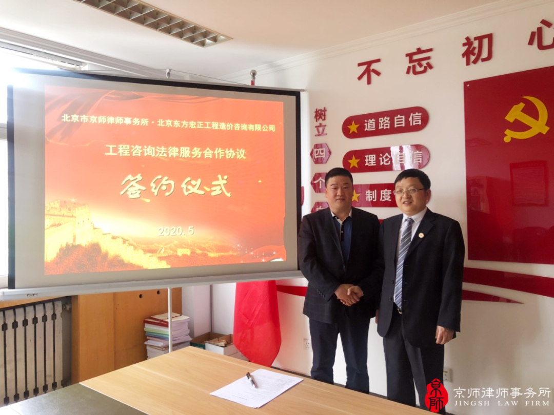 2020年5月11日,北京東方宏正工程造價咨詢有限公司與京師律師事務(wù)所簽訂工程咨詢法律服務(wù)合作協(xié)議,雙方在施工總承包、工程總承包、PPP、BOT等各類建設(shè)項目的招標(biāo)代理、造價咨詢、全過程項目管理等咨詢服務(wù)領(lǐng)域達成全面合作。